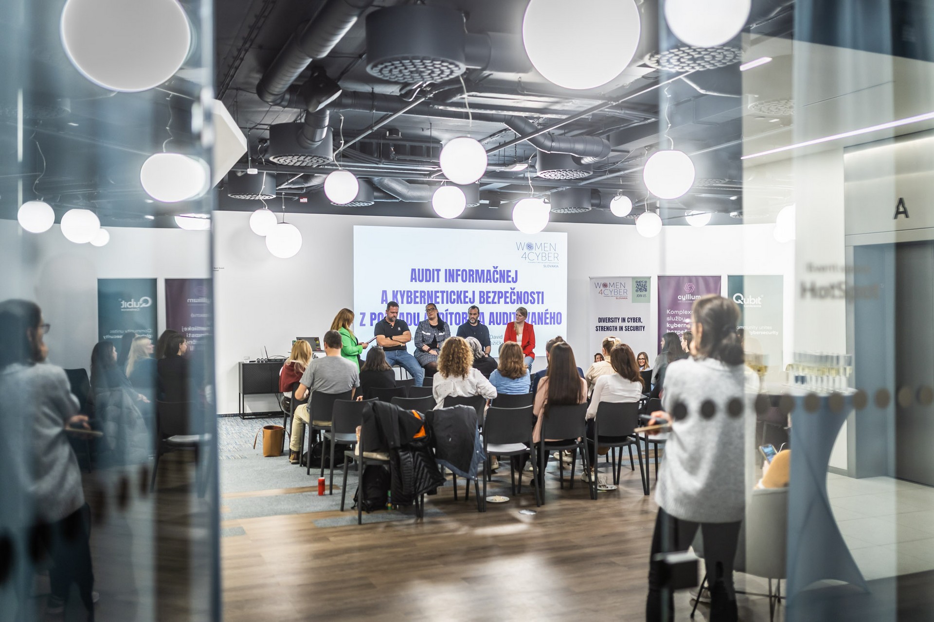 Po Majkinej soft-skillovej prednáške nasledovala panelová diskusia na tému, ktorá je pre niektoré naše členky každodenným chlebíčkom: audit informačnej a kybernetickej bezpečnosti.